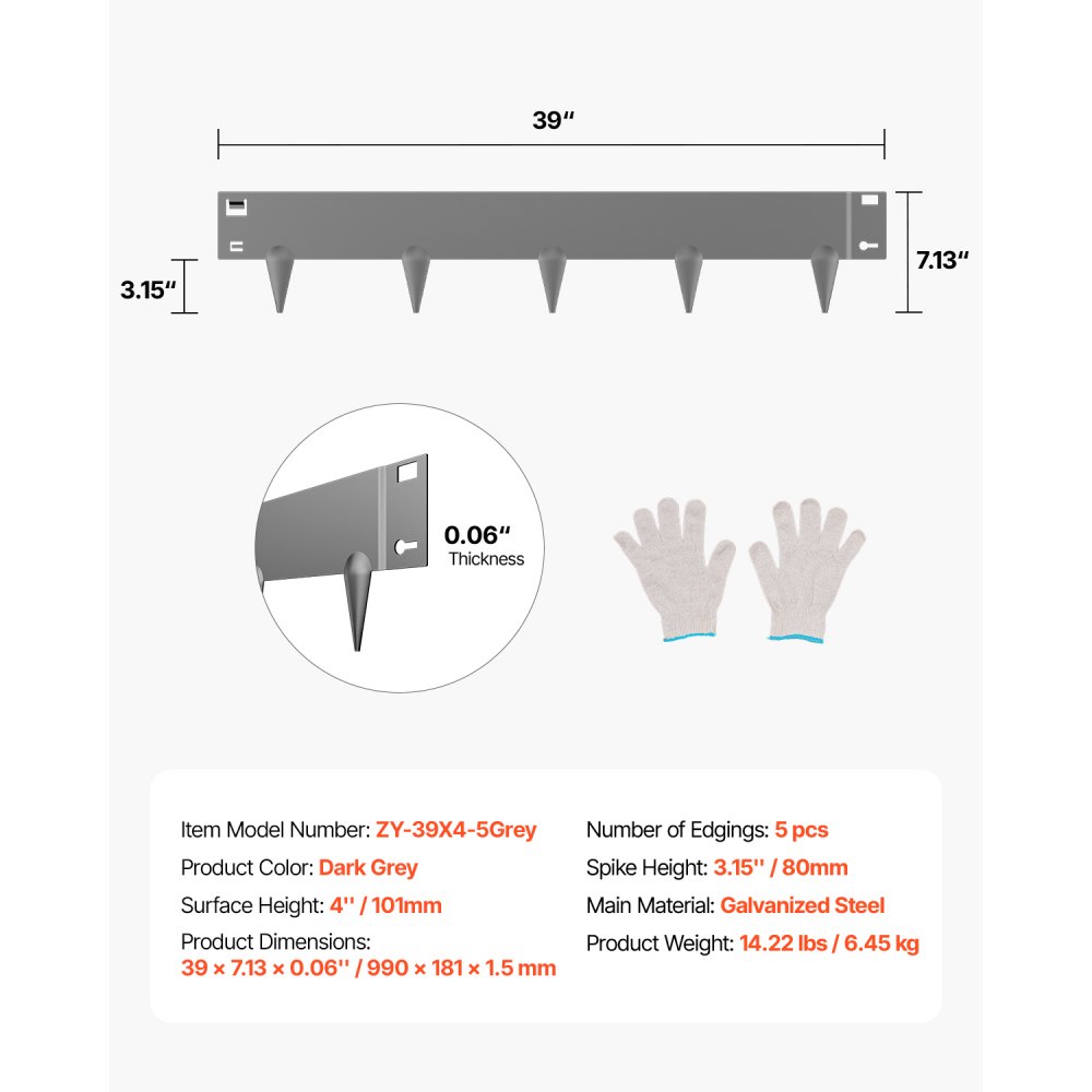 Obrzeże trawnikowe VEVOR, zestaw 5 szt., obrzeże rabatowe 990 x 181 mm, metalowa obwódka rabaty, giętka obwódka rabaty, wytrzymała palisada ogrodowa, łatwa w montażu, rozdzielacz ścieżek ogrodowych, ciemnoszary - Ogród i trawnik | Galaxy Sklep