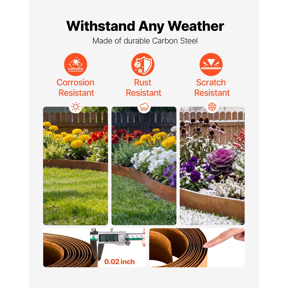 Wytrzymała stal węglowa: Ta metalowa obrzeże trawnikowe jest wykonane ze stali węglowej z poddaną obróbce powierzchnią, która chroni przed rdzą, blaknięciem i pękaniem. Dzięki temu obrzeża Twojego ogrodu pozostaną schludne i niezawodne, nawet w zmiennych warunkach pogodowych.