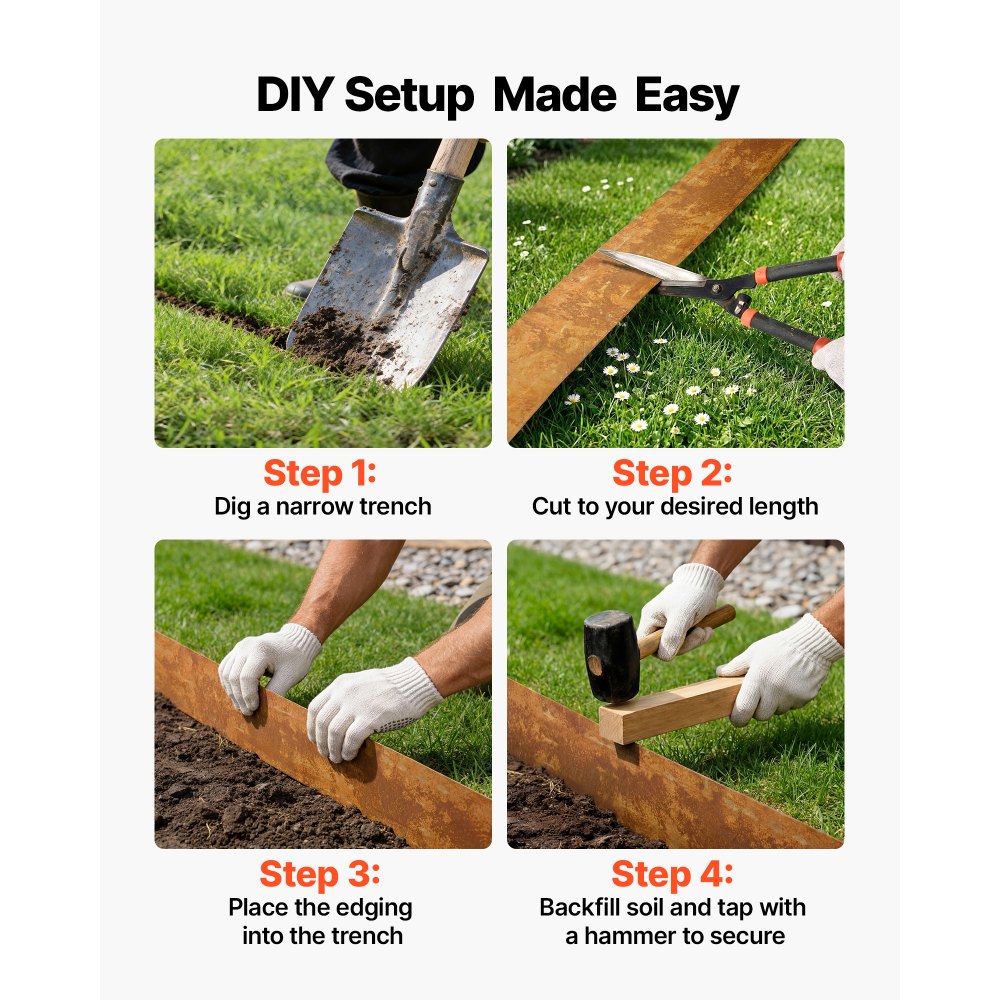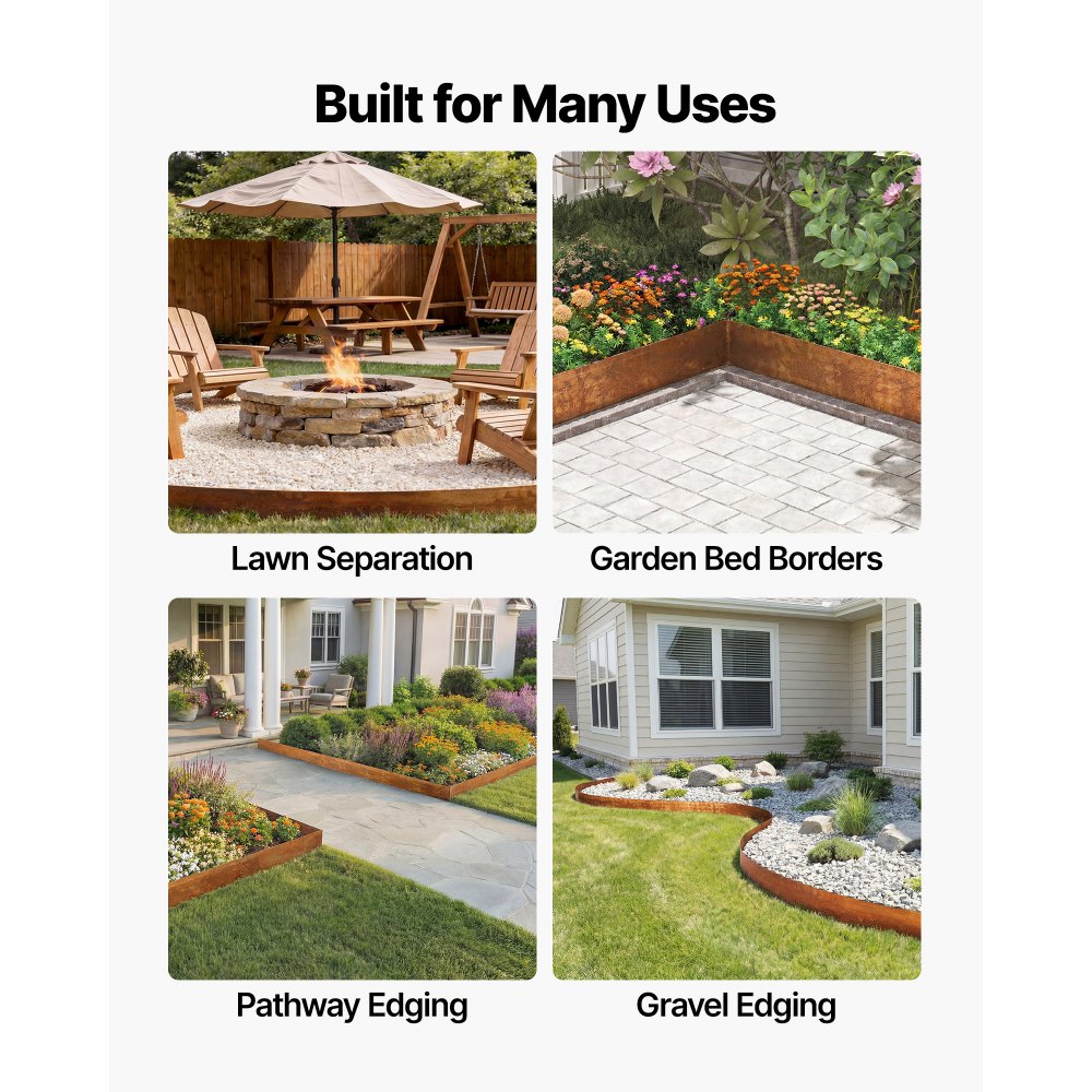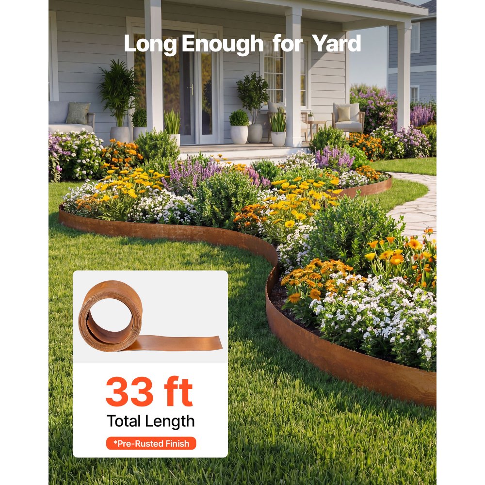 10 m (33 stopy) długości ciągłej: Ta metalowa obrzeże trawnikowe umożliwia skoszenie całej rolki o długości 10 m (33 stopy) na dużych obszarach ogrodu za jednym razem. Mniej przerw oznacza czystsze linie i mniej czasu spędzonego na regulacji poszczególnych sekcji.