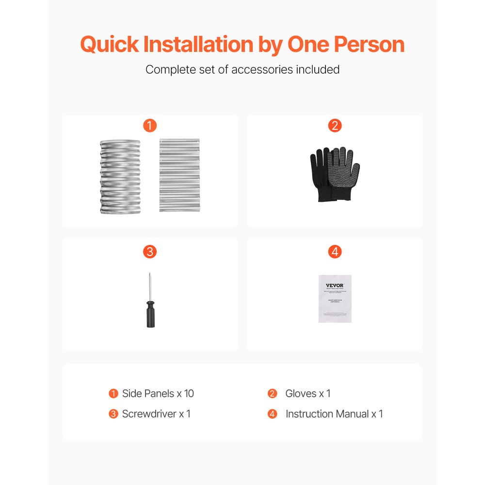 Zawartość opakowania: Nasz zestaw do sadzonek zawiera 10 paneli, 1 parę rękawiczek, 1 śrubokręt i 1 instrukcję obsługi.