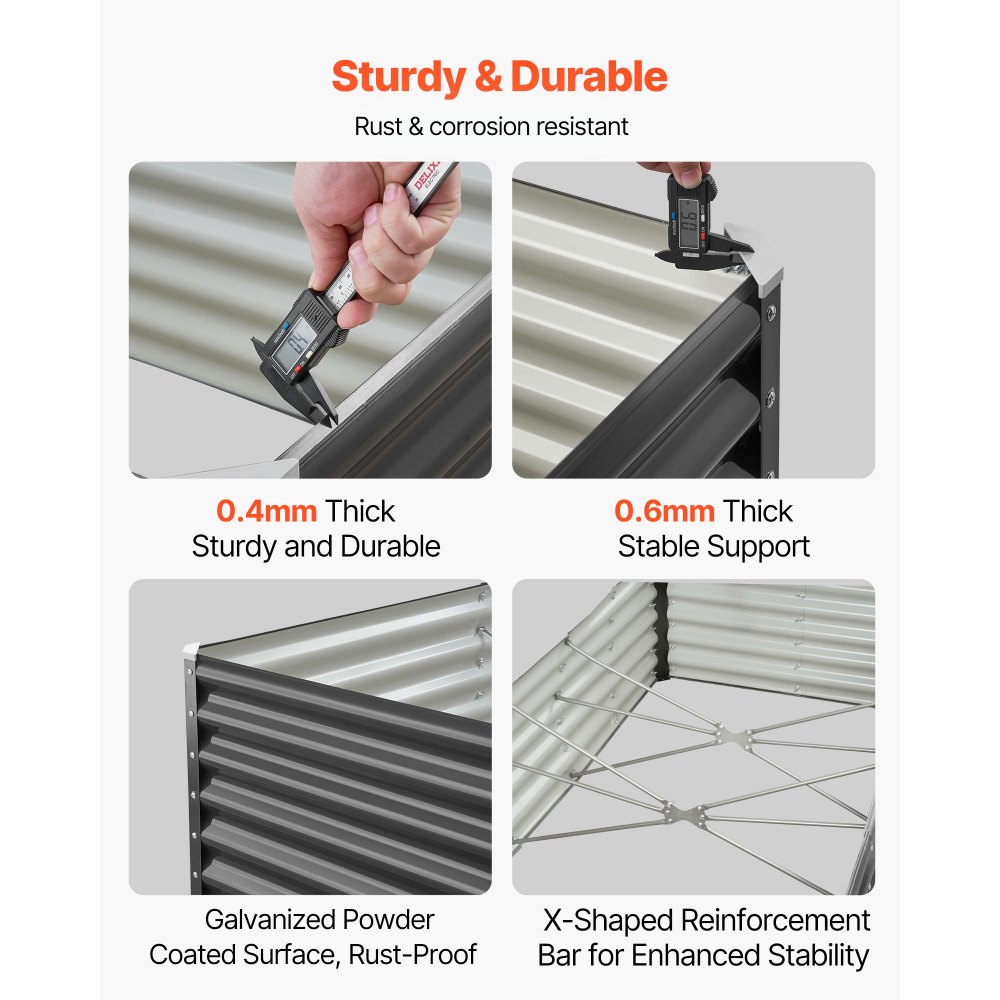 Solidne i niezawodne: To metalowe, podwyższone łóżko składa się z paneli bocznych o grubości 0,4 mm i łączników narożnych o grubości 0,7 mm. Jest odporne na rdzę dzięki ocynkowanej, malowanej proszkowo powierzchni. 12 wewnętrznych podpór w kształcie litery X zapewnia dodatkową stabilność i zapobiega przewróceniu się na wietrze.