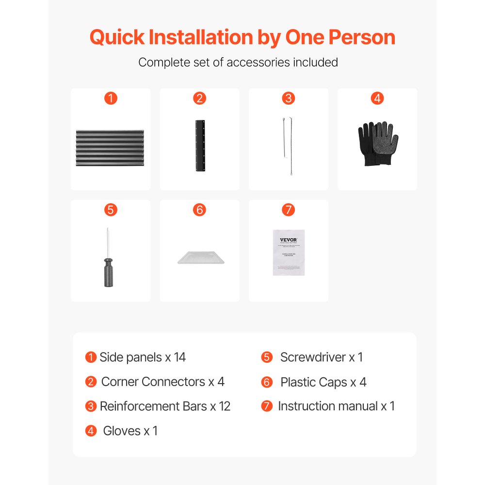 Zawartość opakowania: Nasza skrzynia na rośliny zawiera 14 paneli bocznych, 4 panele narożne, 12 poprzeczek, 4 plastikowe zaślepki, 1 zestaw montażowy i 1 instrukcję obsługi.