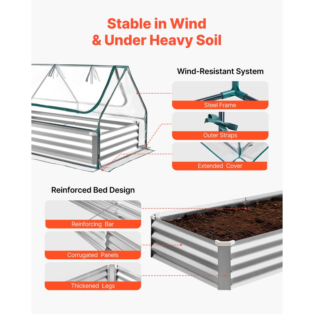 Wzmocniona i stabilna konstrukcja: Ta donica ogrodowa jest wyposażona w solidne nogi, panele boczne i podpory, które zapobiegają wybrzuszaniu, nawet w mokrej glebie. Szklarnia, dzięki stalowej ramie i przedłużonej osłonie, jest odporna na wiatr i stabilna.
