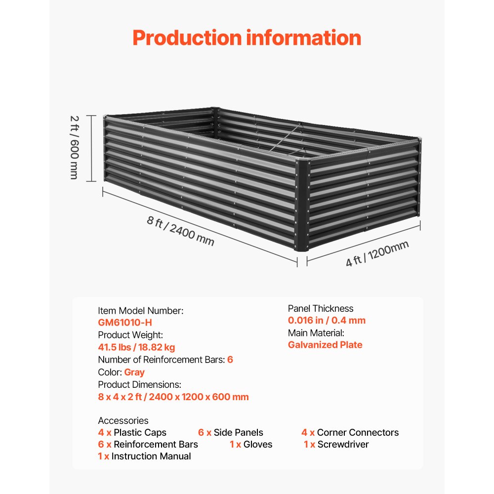Stwórz ogród marzeń: Nasza podwyższona grządka o wymiarach 2400 x 1200 x 600 mm (7,87 x 3,94 x 1,97 stopy) oferuje mnóstwo miejsca dla Twoich roślin. Głębokość 0,6 m idealnie nadaje się do uprawy różnych gatunków roślin. Uprawiaj warzywa, owoce, kwiaty i zioła w ogrodzie, na polu lub na zewnątrz.