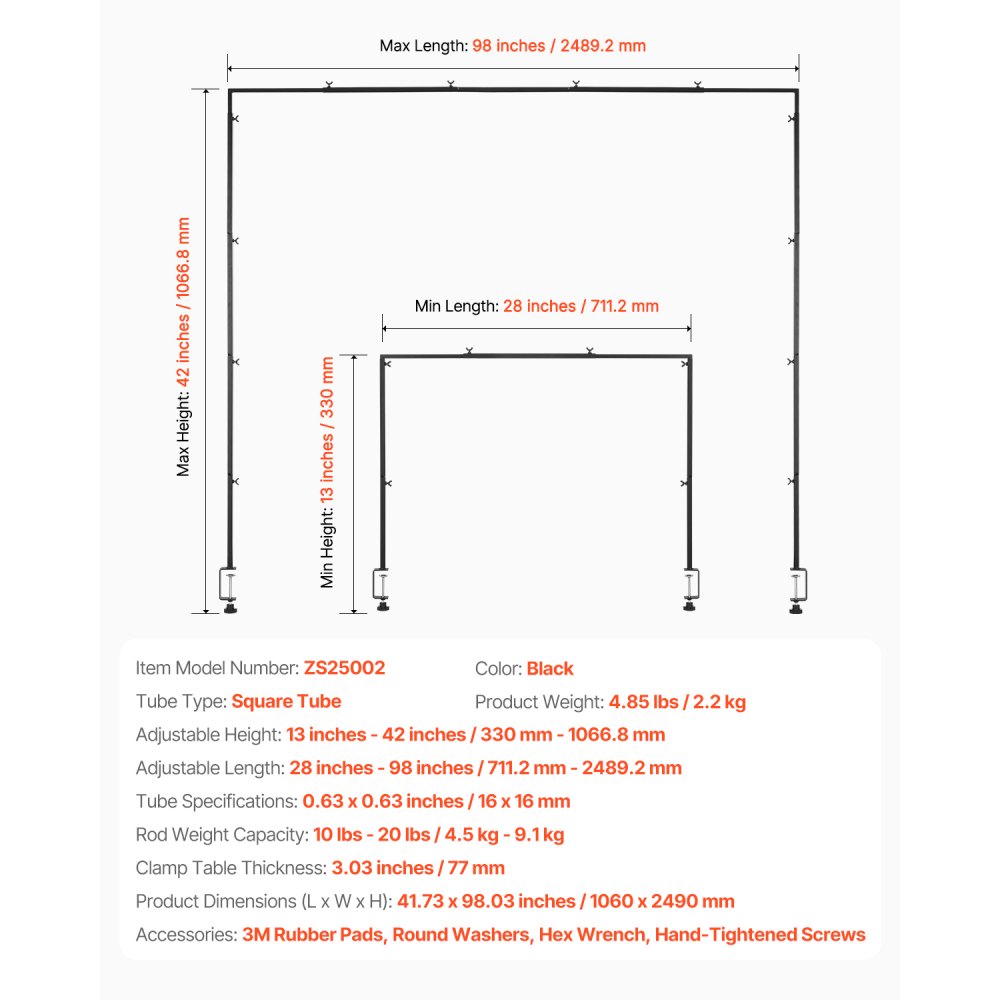 Solidna, nośna konstrukcja: Ten stojak na stół wykonany jest z kwadratowych rur i zacisków C o średnicy 77 mm, oferując nośność od 4,5 kg do 9,1 kg. Dzięki temu jest trwalszy i stabilniejszy niż konwencjonalne cienkie okrągłe rurki. Odporne na rdzę, malowane proszkowo wykończenie wytrzymuje działanie czynników atmosferycznych.