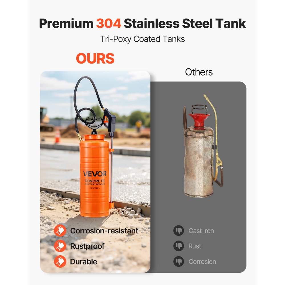 Przemysłowy opryskiwacz ciśnieniowy VEVOR, opryskiwacz ze stali nierdzewnej o pojemności 13,2 l, opryskiwacz z pompą o wysokiej wydajności, lanca z ergonomicznym uchwytem pistoletowym, wąż, 2 mosiężne dysze, idealny do prac budowlanych i ogrodowych