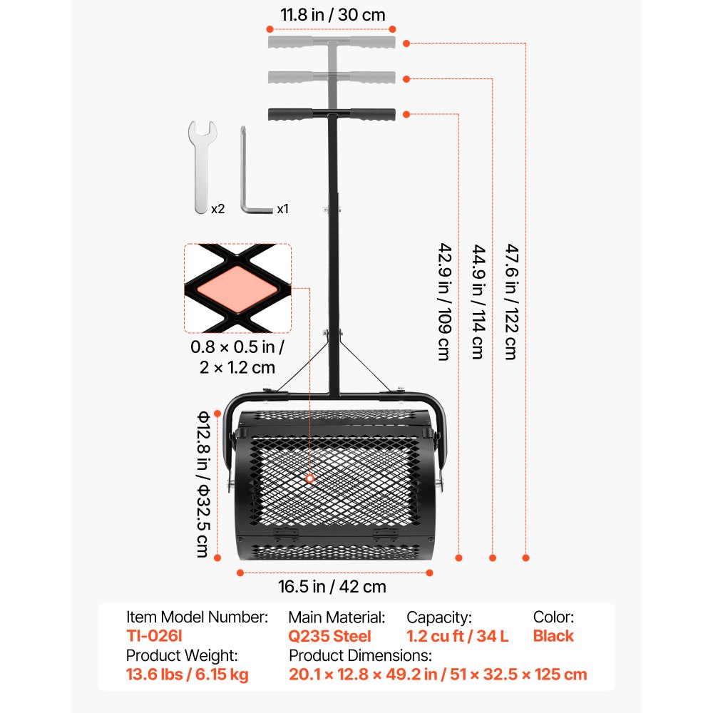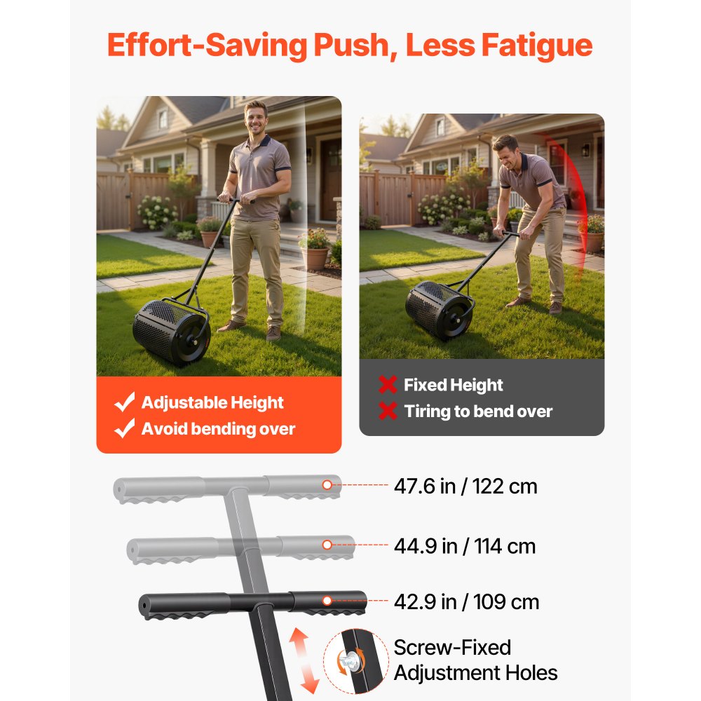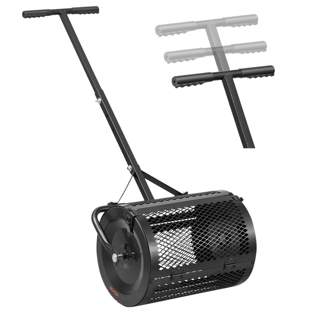 Rozrzutnik kompostu VEVOR 34 l, szerokość 42 cm, rozrzutnik torfu z uchwytem w kształcie litery T, rozrzutnik torfu, 3-stopniowa regulacja wysokości, stalowy wałek kompostowy malowany proszkowo, rozrzutnik obornika do sadzenia i siewu, czarny - Ogród i trawnik | Galaxy Sklep