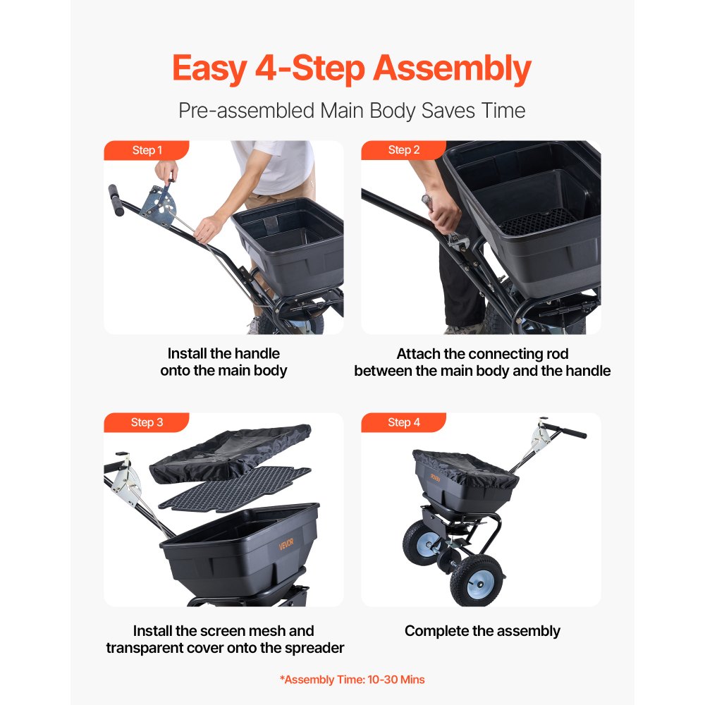 Konstrukcja wstępnie zmontowana: Nasz rozsiewacz nasion dostarczany jest z kluczowymi komponentami zamontowanymi fabrycznie, co minimalizuje ryzyko brakujących części, przyspiesza montaż o 60% i zapewnia sprawniejszy i bardziej wydajny montaż.