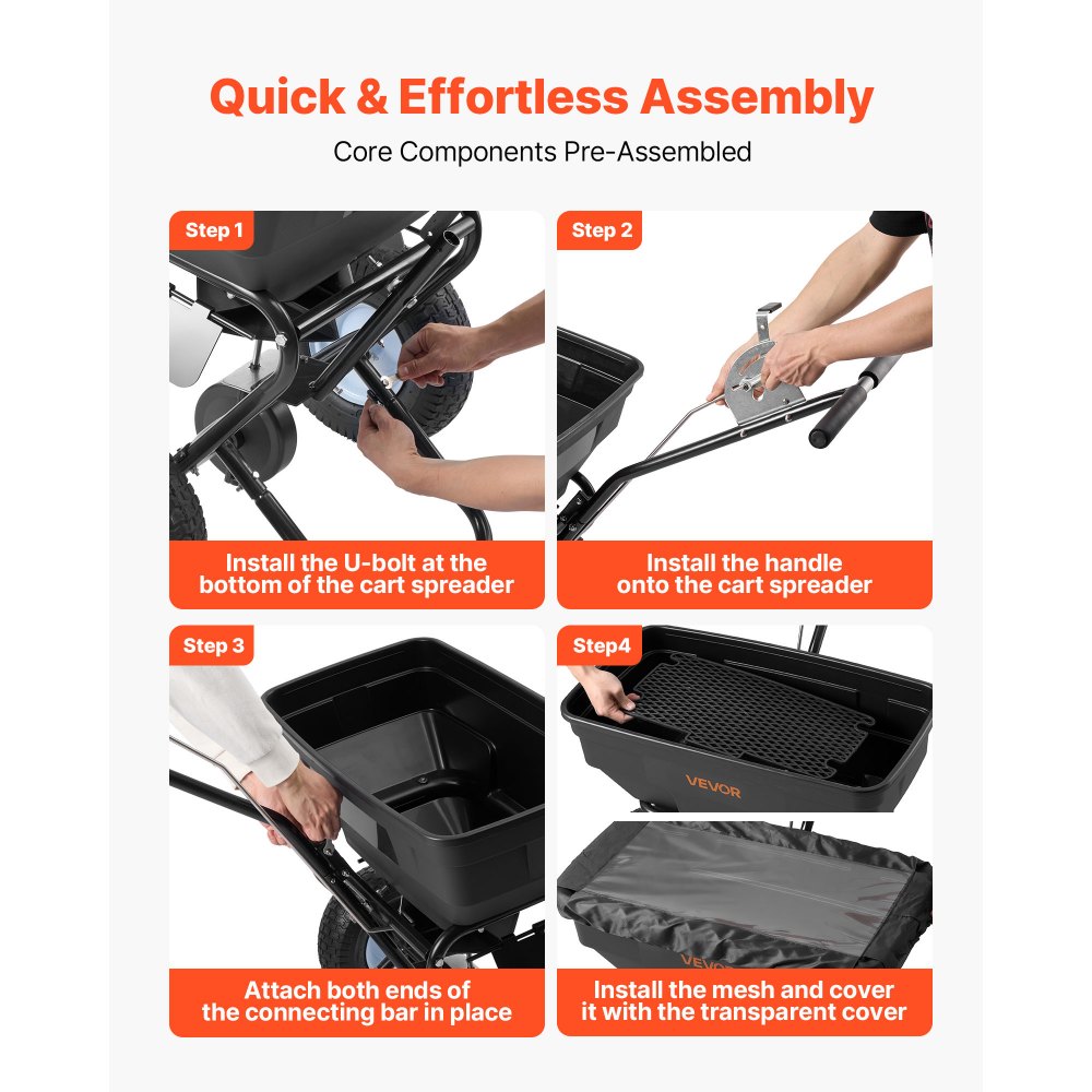 Łatwy montaż: Nasz rozsiewacz odśrodkowy jest dostarczany w stanie zmontowanym ze wszystkimi niezbędnymi elementami – bez wiercenia ani specjalistycznych narzędzi. Nawet osoby starsze i początkujące poradzą sobie z jego montażem przy minimalnym wysiłku.
