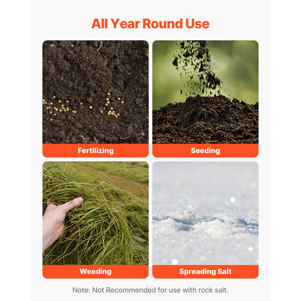 Całoroczne użytkowanie: Nasz rozsiewacz nasion nadaje się do stosowania o każdej porze roku: wysiewaj nasiona wiosną, nawoź latem, zwalczaj chwasty jesienią i rozsypuj sól drogową zimą. Idealny do ogrodów przydomowych, działek i małych gospodarstw rolnych.