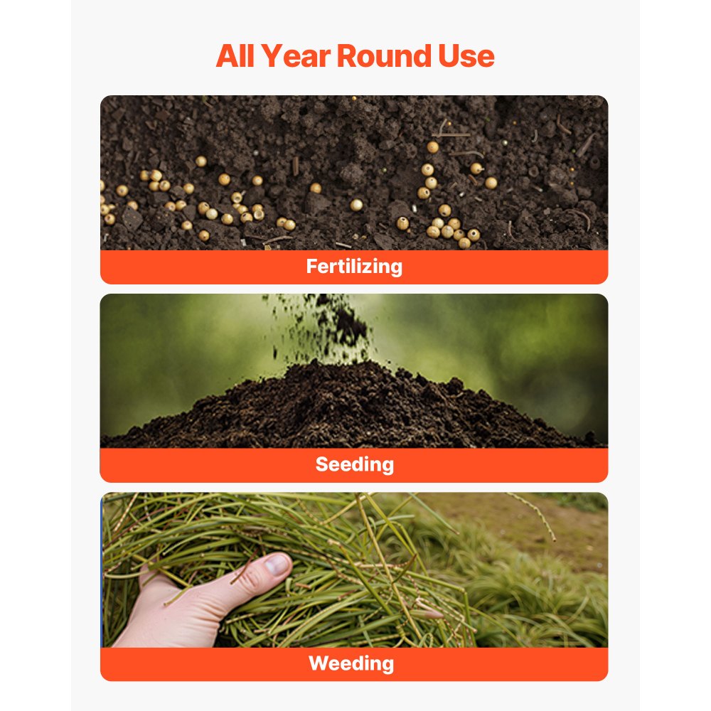 Całoroczne zastosowanie: Nasz rozsiewacz nadaje się do stosowania o każdej porze roku: do siewu wiosną, nawożenia latem i zwalczania chwastów jesienią. Idealny do ogrodów przydomowych, działek i małych gospodarstw rolnych.