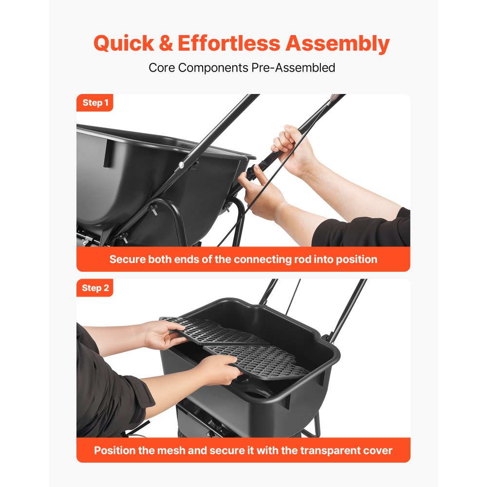 Łatwy montaż: Główne elementy są wstępnie zmontowane – nie wymaga wiercenia. Rozsiewacz nawozu jest łatwy w montażu, idealny dla seniorów i początkujących użytkowników.
