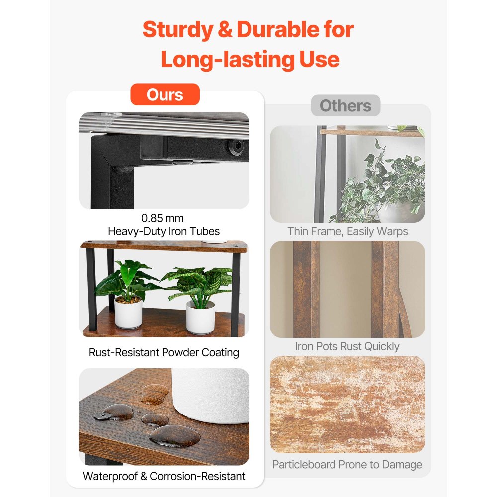 Solidny i trwały: Stojak na rośliny z lampą do uprawy wykonany jest z rur żeliwnych o grubości 0,85 mm, malowanych proszkowo, co zapewnia solidną konstrukcję, wysoką nośność i odporność na rdzę. Wzmocnione płyty wiórowe z wodoodporną powłoką zapobiegają korozji i odkształceniom.