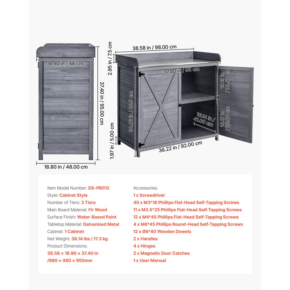 Stół do sadzenia VEVOR, stół ogrodnika, stół roboczy do ogrodu z szafką dolną i dużym blatem, szafka ogrodowa z dużą przestrzenią do przechowywania, stolik na kwiaty na patio i do ogrodu, szary, 980x480x950 mm