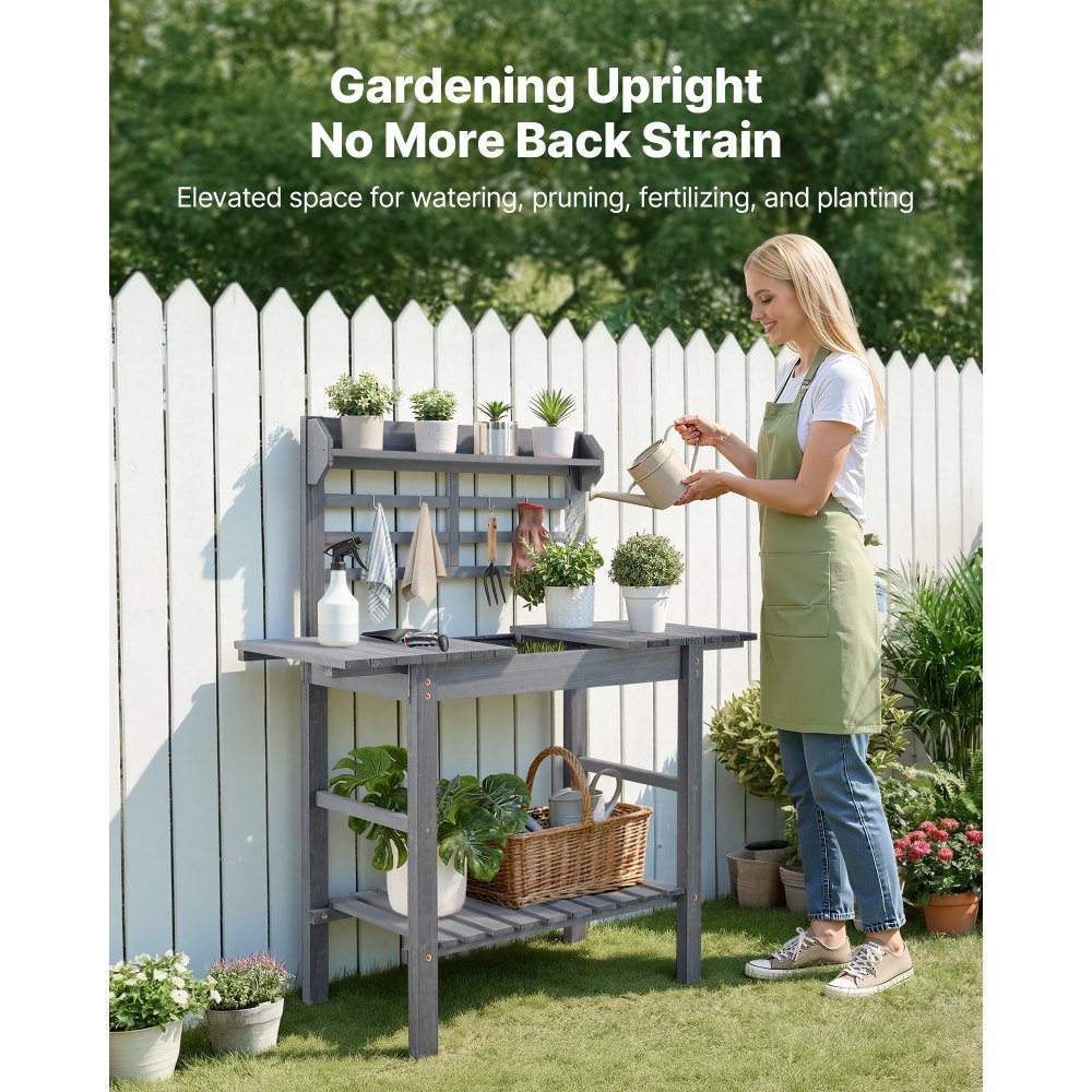 Stół do sadzenia VEVOR, stół ogrodnika, stół roboczy do ogrodu ze zlewem, regulowany drewniany blat, półki i haczyki, stolik na kwiaty, stół do przesadzania na patio i do ogrodu, styl półki, 940–1400 x 460 x 1400 mm - Ogród i trawnik | Galaxy Sklep