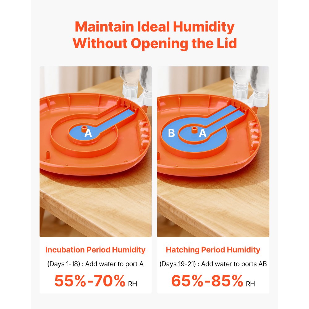 Automatyczne uzupełnianie wody: Inkubator do jajek wyposażony jest w automatyczny, dwustrefowy system uzupełniania AB, który umożliwia dolewanie wody bez otwierania pokrywy. Jedna butelka wystarcza na 8–10 dni, minimalizując konieczność ręcznego uzupełniania i zapewniając optymalną wilgotność.