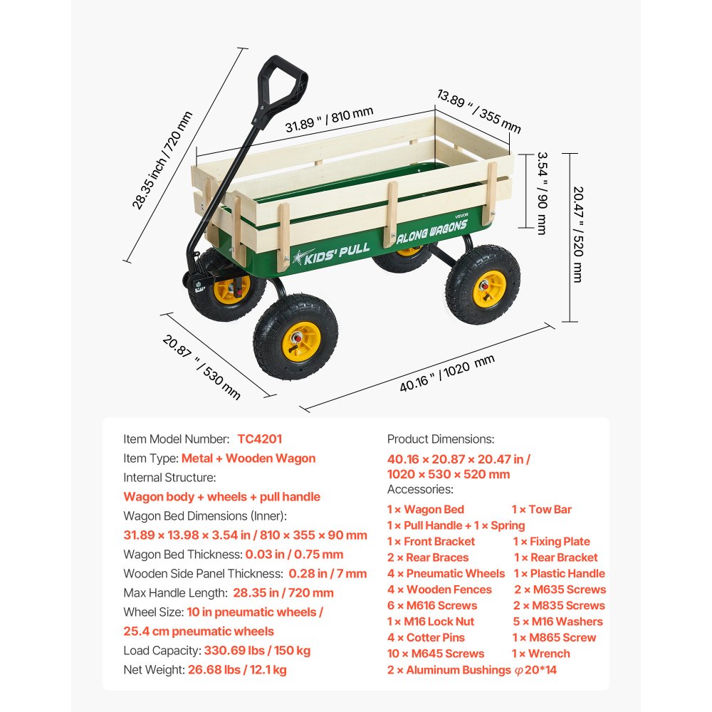 Wózek dziecięcy VEVOR, 102 cm, wózek transportowy z uchwytem, wykonany z drewna i metalu, maks. ładowność 150 kg, idealny dla dzieci w wieku od 5 lat, do ogrodu, na wycieczki i na plażę, w kolorze zielono-żółtym - Ogród i trawnik | Galaxy Sklep
