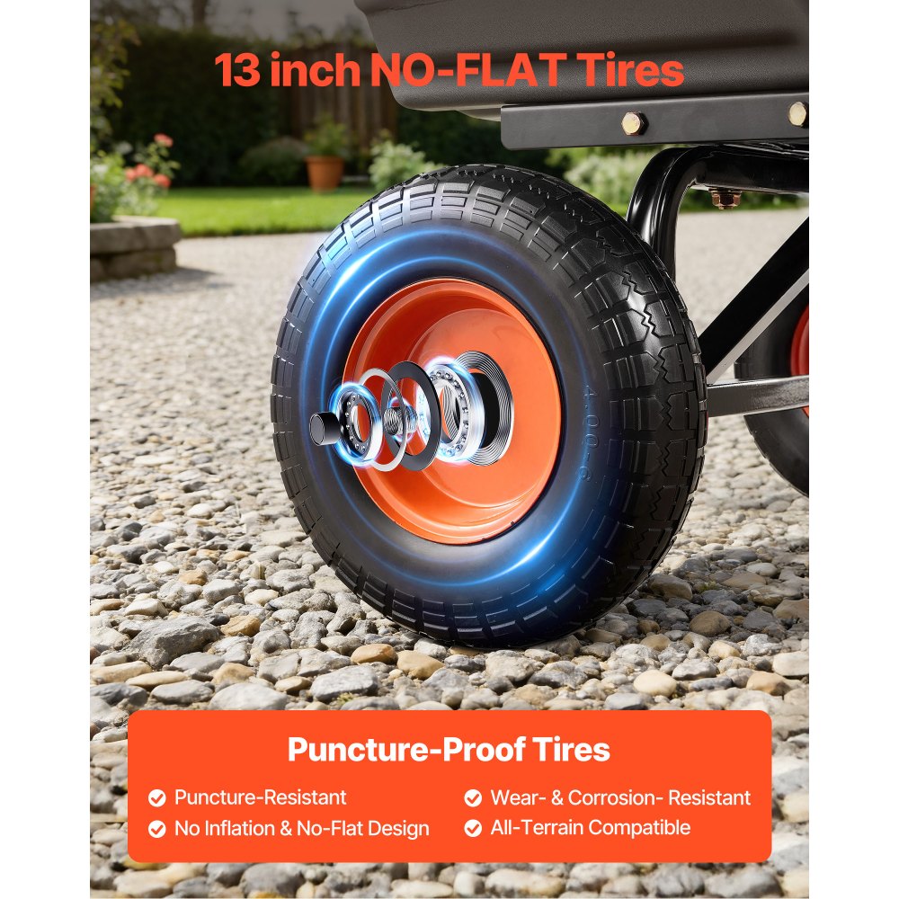 Wózek ogrodowy VEVOR z funkcją wywrotu, udźwig 544 kg, obrotowy o 270°, do prac ogrodowych, wykonany z tworzywa sztucznego i stali, z 13-calowymi oponami poliuretanowymi i metalowym ogrodzeniem do trawników, żwiru i błota