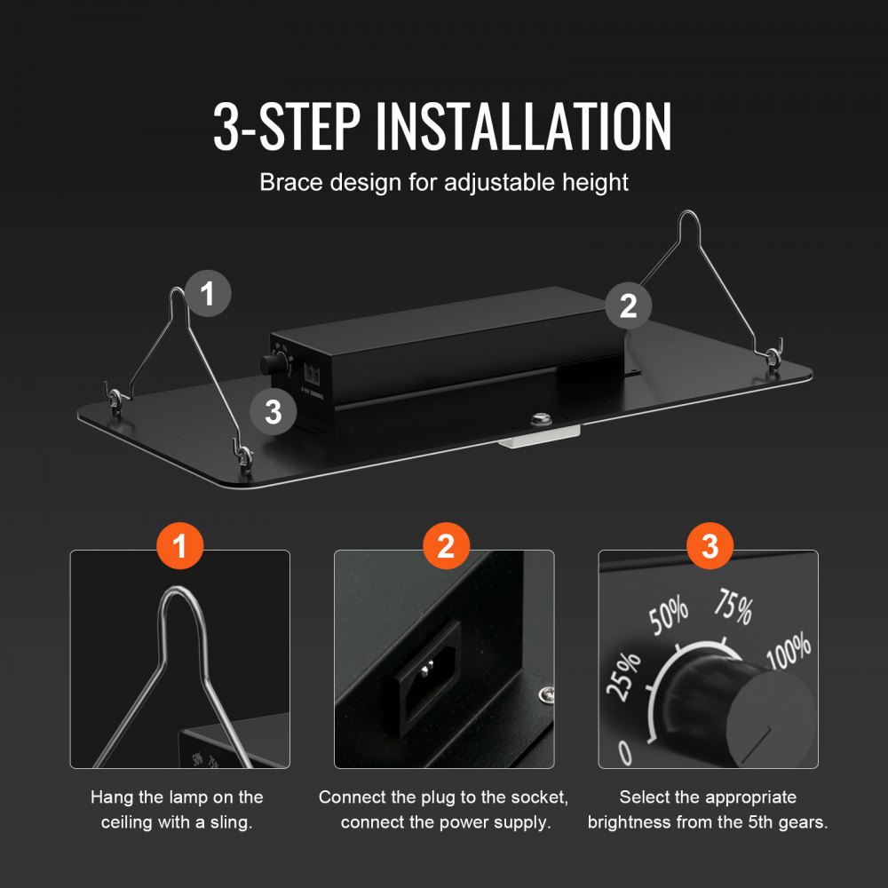 Bezproblemowy montaż i regulacja: Nasza lampa do uprawy jest wyposażona w drążek podporowy i można ją regulować na dowolnej wysokości, co zapewnia stabilność i elastyczność montażu. Pięć poziomów jasności pozwala na swobodną regulację intensywności światła. Połączenie wielu lamp z równomiernym ściemnianiem jest szczególnie korzystne w przypadku upraw na dużą skalę w pomieszczeniach i upraw komercyjnych, pozwalając przejąć kontrolę nad każdą przestrzenią.