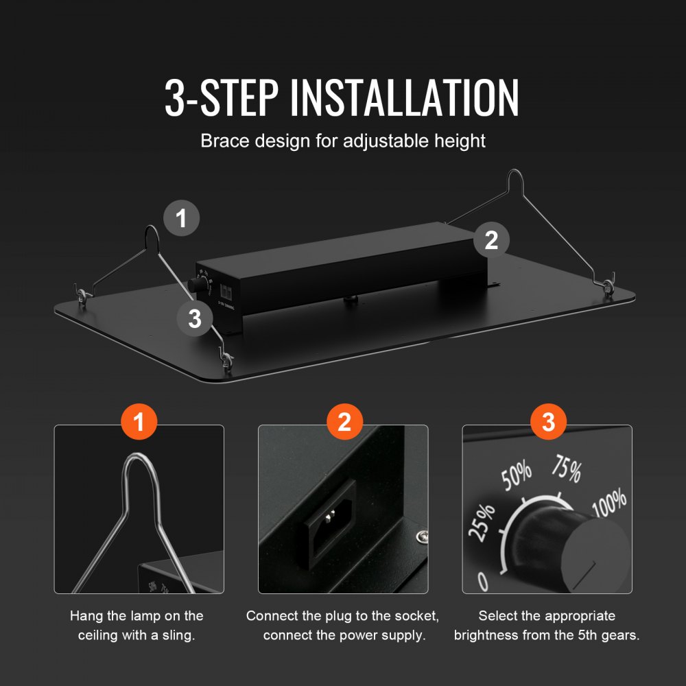 Bezproblemowy montaż i regulacja: Nasza lampa do uprawy jest wyposażona w drążek podporowy i można ją regulować na dowolnej wysokości, co zapewnia stabilność i elastyczność montażu. Pięć poziomów jasności pozwala na swobodną regulację intensywności światła. Połączenie wielu lamp z równomiernym ściemnianiem jest szczególnie korzystne w przypadku upraw na dużą skalę w pomieszczeniach i upraw komercyjnych, pozwalając przejąć kontrolę nad każdą przestrzenią.
