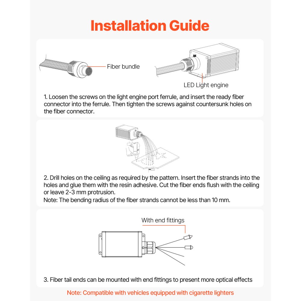 Wysokiej jakości światłowody: Lampa ta składa się z 450 światłowodów o długości 3 m (średnica 0,8 cm) i zapewnia miękkie, równomierne światło. W połączeniu ze źródłem światła RGBW o mocy 16 W zwiększa jasność i tworzy bardziej realistyczny efekt rozgwieżdżonego nieba.