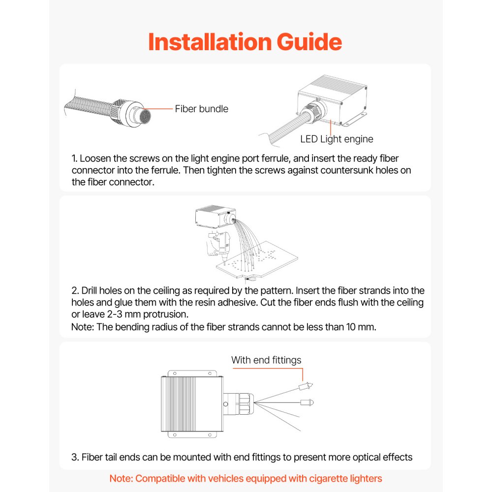Wysokiej jakości światłowody: Lampa ta składa się z 900 światłowodów o długości 3 m (średnica 0,8 cm) i zapewnia miękkie, równomierne światło. W połączeniu ze źródłem światła RGBW o mocy 20 W zwiększa jasność i tworzy bardziej realistyczny efekt rozgwieżdżonego nieba.