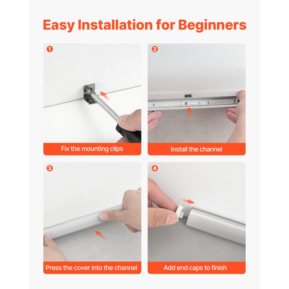 Łatwa instalacja: Najpierw zamocuj klipsy montażowe, następnie zamontuj szynę LED, włóż taśmę LED, dociśnij pokrywę i zamontuj zaślepki. Dzięki kompletnemu zestawowi akcesoriów nawet początkujący poradzą sobie z szybką i łatwą instalacją.
