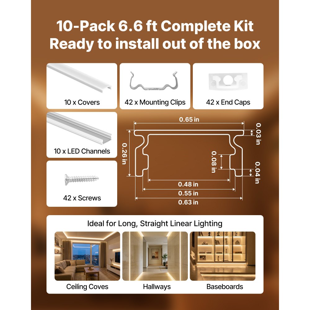 Profile LED VEVOR, 10 szt., 2 m, anodowane profile aluminiowe z mleczną osłoną, zaślepki i klipsy montażowe, kanały, dyfuzor do taśm LED, idealne do blatów pod szafkami, kształt litery U - Oświetlenie | Galaxy Sklep