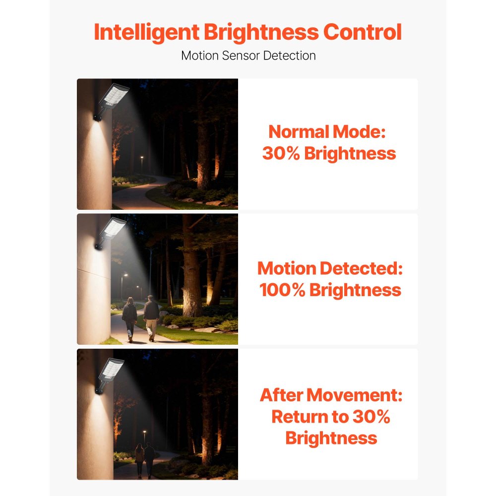 Inteligentne sterowanie, konfigurowalne oświetlenie: Nasza zasilana energią słoneczną lampa uliczna LED jest sterowana za pomocą bezprzewodowego pilota i oferuje cztery tryby pracy. Czujnik ruchu automatycznie reguluje jasność, czujnik zmierzchu i świtu włącza i wyłącza światło, timer jest regulowany, a jasność można również regulować ręcznie.