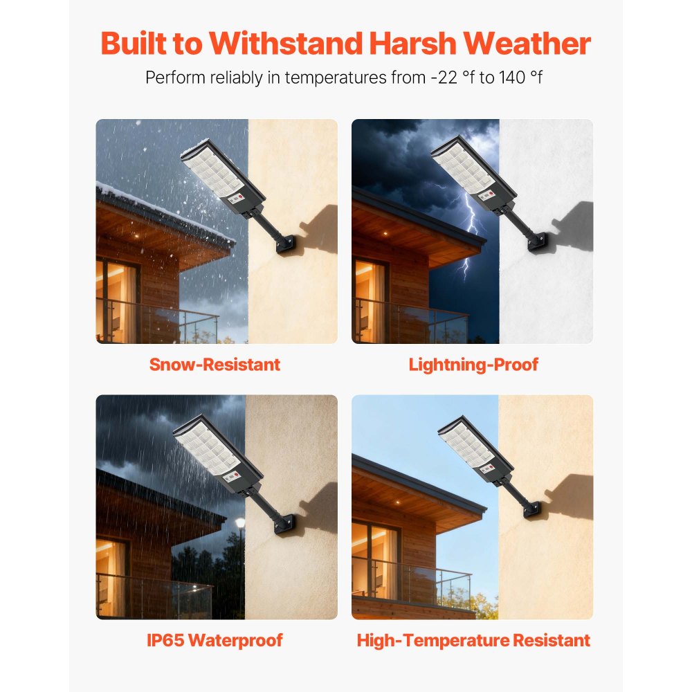 Wysoka odporność na warunki atmosferyczne: Dzięki zintegrowanej konstrukcji ta solarna lampa uliczna jest wytrzymała i odporna na stłuczenie. Posiada stopień ochrony IP65, jest wodoodporna i działa niezawodnie w deszczu, śniegu, wysokich temperaturach i trudnych warunkach pogodowych.