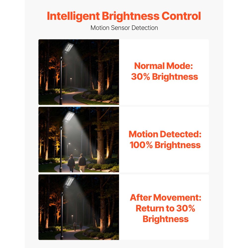 Jasna solarna lampa uliczna: Wyposażona w 5730 wysokowydajnych diod LED, ta zewnętrzna solarna lampa uliczna o mocy 12 000 W zapewnia mocną, szerokokątną wiązkę światła o kącie 240° i imponującej mocy 900 000 lumenów. Rozświetl każdy zakątek swojego ogrodu.