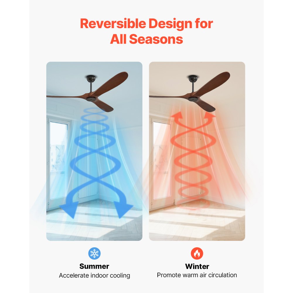 Odpowiedni na każdą porę roku: wiosną, latem, jesienią czy zimą, ten wentylator sufitowy z rewersyjnym silnikiem spełni wszystkie Twoje potrzeby. Latem obraca się przeciwnie do ruchu wskazówek zegara, aby poprawić cyrkulację powietrza i schłodzić pomieszczenie. Zimą obraca się zgodnie z ruchem wskazówek zegara, aby równomiernie rozprowadzać ciepłe powietrze dla większego komfortu.