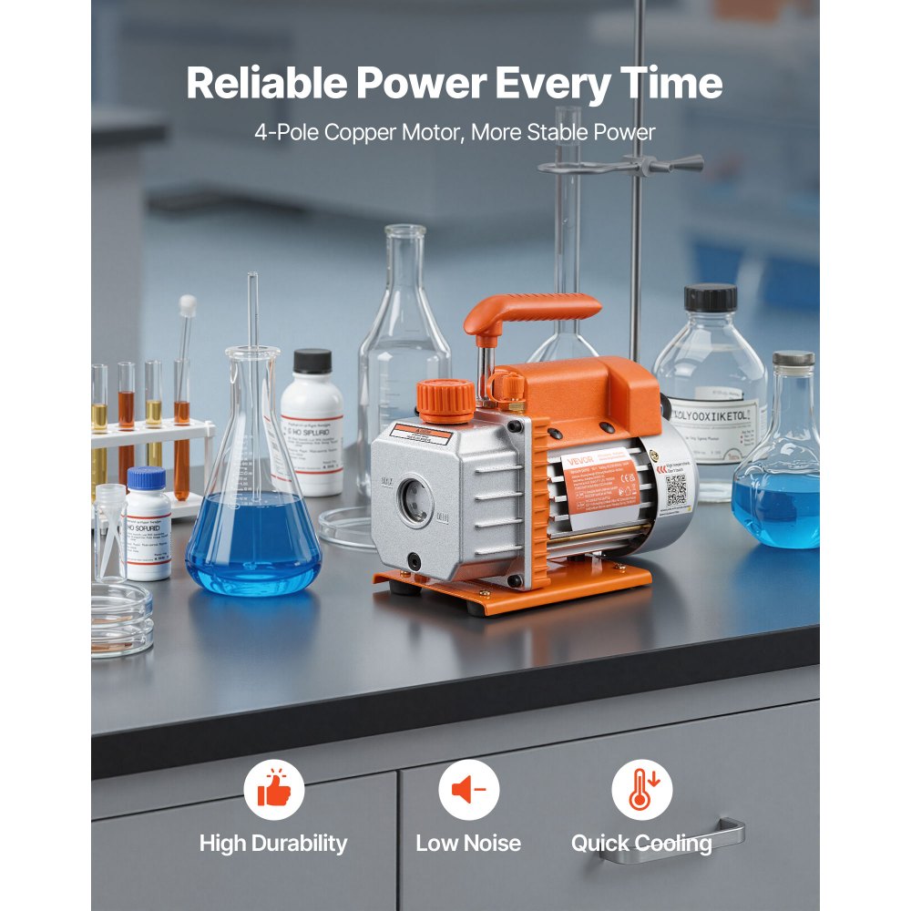 Stabilna i niezawodna praca: Wyposażona w 4-biegunowy silnik o wysokiej wydajności, ta pompa próżniowa do systemów ogrzewania, wentylacji i klimatyzacji pracuje wydajnie i przez długi czas. Obudowa z żeliwa i odlewu aluminiowego ze zintegrowanym wentylatorem zapobiega przegrzaniu, zapewniając tym samym stabilną pracę.