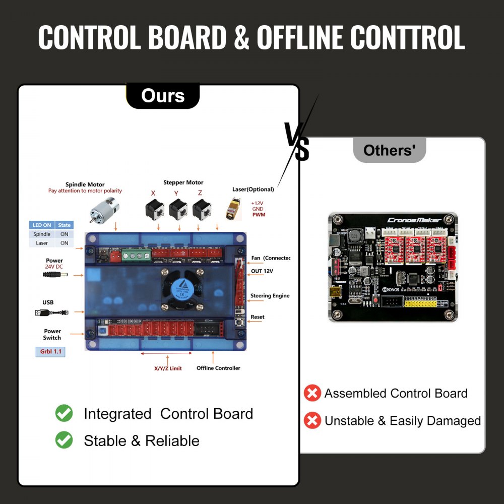 Ulepszona płyta sterownicza: Zintegrowany kontroler GRBL zapewnia pełną funkcjonalność i stabilność. Zalety sterowania offline: 1. Brak konieczności połączenia z komputerem; 2. Swobodny wybór plików offline do grawerowania; 3. Ręczne ustawienie pozycji osi X, Y i Z jako punktu początkowego grawerowania; oraz ręczne włączanie i wyłączanie wrzeciona. 4. Wysoka precyzja: poniżej 0,08 mm (0,003 cala).