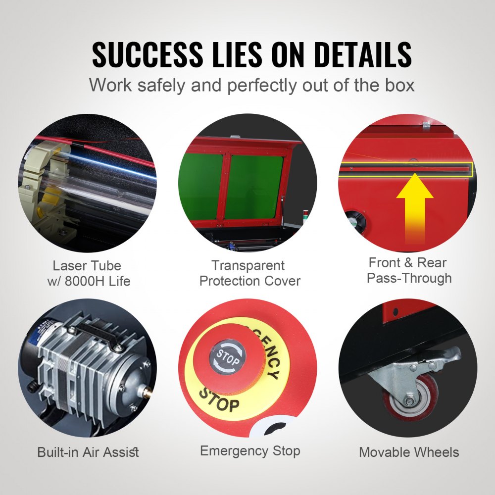 Bezpieczna i łatwa obsługa: Pracuj bez obaw! Przezroczyste okienko jest przyciemniane, aby chronić oczy, umożliwiając monitorowanie procesu grawerowania w dowolnym momencie. Zasilanie wyłącza się automatycznie po otwarciu. Dostępny jest przycisk zatrzymania awaryjnego na wypadek awarii. Nasza maszyna laserowa CO₂ jest również wyposażona w system wspomagania sprężonym powietrzem, który usuwa dym, kurz i iskry. Ruchome koła zapewniają płynną pracę.