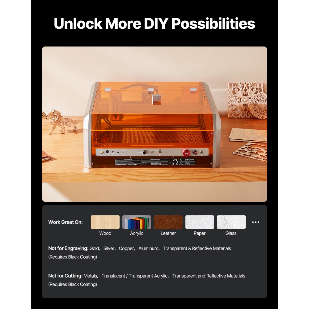 Wszechstronne wsparcie materiałów: Nasz laser diodowy idealnie nadaje się do grawerowania drewna, skóry, papieru, akrylu i innych materiałów. Nie nadaje się do grawerowania złota, srebra, miedzi, aluminium, materiałów przezroczystych ani odblaskowych (wymagana czarna powłoka). Nie nadaje się do grawerowania metali, akrylu półprzezroczystego/przezroczystego ani materiałów przezroczystych i odblaskowych (wymagana czarna powłoka).