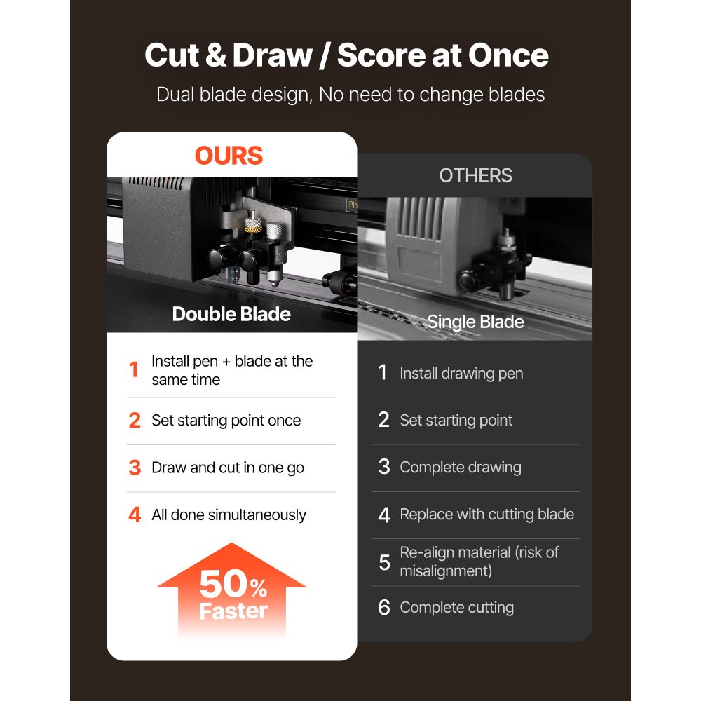 Konstrukcja dwuostrzowa: Nasz ploter tnący do winylu jest wyposażony w ostrza główne i pomocnicze do jednoczesnego rysowania, cięcia i bigowania. Ręczna wymiana ostrzy nie jest wymagana. Pojedyncza konfiguracja pozwala na wykonywanie wielu operacji, co znacznie zwiększa wydajność.