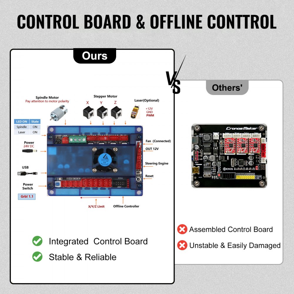Ulepszona płyta sterownicza: Zintegrowany kontroler GRBL zapewnia pełną funkcjonalność i stabilność. Zalety sterowania offline: 1. Brak konieczności podłączania do komputera; 2. Swobodny wybór plików do grawerowania offline; 3. Ręczne ustawienie pozycji osi X, Y i Z jako punktu początkowego grawerowania; oraz ręczne włączanie i wyłączanie wrzeciona. 4. Wysoka precyzja: poniżej 0,07 mm (0,003 cala).