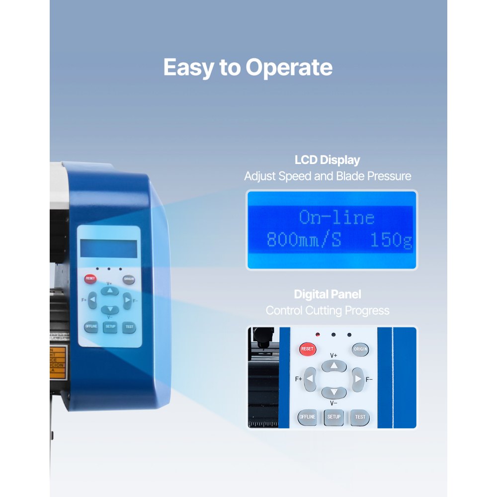 Wydajny wyświetlacz LED: Ten ploter tnący posiada podświetlany wyświetlacz LED oraz duży panel sterowania, co upraszcza dotychczas uciążliwą obsługę przycisków i sprawia, że obsługa jest znacznie przejrzysta. Dzięki regulowanemu naciskowi cięcia w zakresie 20–500 g i regulowanej prędkości cięcia w zakresie 20–800 mm/s urządzenie to zapewnia czułą i inteligentną pracę.