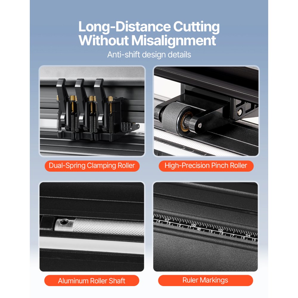 PRECYZYJNE CIĘCIE: Wyposażona w trzy wymienne ostrza i precyzyjną linijkę tnącą, ta przecinarka do winylu znana jest z niezwykle ostrych i precyzyjnych cięć. Maksymalna szerokość cięcia: 1260 mm (49,6 cala); maksymalny posuw papieru: 53,1 cala (1350 mm); Precyzja cięcia: +/- 0,0004 cala (0,01 mm), zdecydowanie spełnia Twoje różnorodne potrzeby.