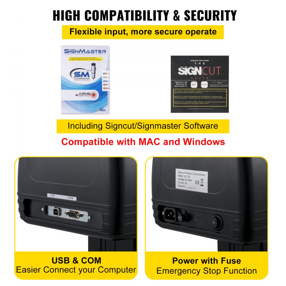 Wysoka kompatybilność i bezpieczeństwo: Ten ploter winylowy zawiera oprogramowanie Signcut i Signmaster, które współpracuje z systemami Mac i Windows przez USB lub interfejs szeregowy. Obsługuje również inne oprogramowania, takie jak Graph-Cut i Flexi. Posiada zasilacz z bezpiecznikiem i funkcją awaryjnego zatrzymania, chroniącą przed niebezpieczeństwem.