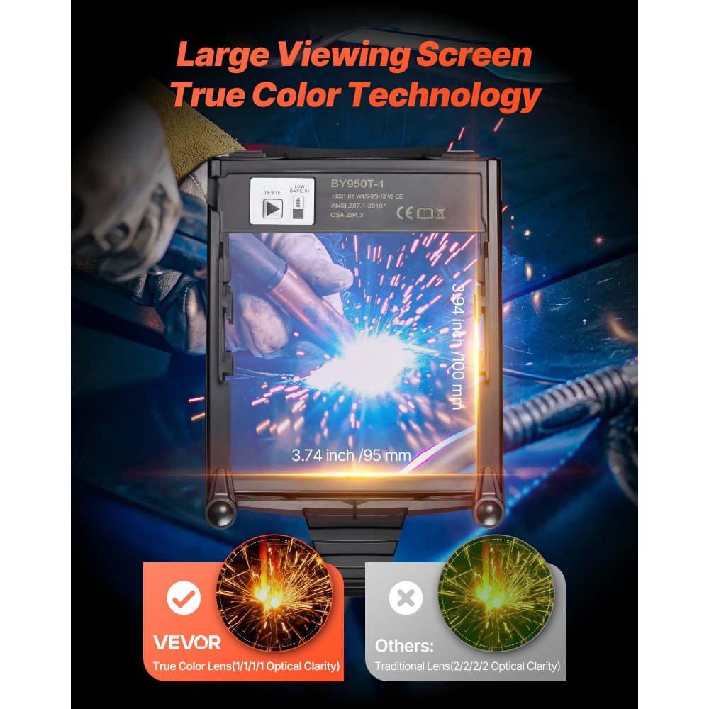 Duży i kolorowy wyświetlacz: Dzięki ekranowi o wymiarach 3,94 x 3,74 cala (100 x 95 mm), ulepszonej technologii kolorów i przejrzystości optycznej 1/1/1/1, przyłbica spawalnicza VEVOR zapewnia wyraźny, ostry i naturalny obraz, co przekłada się na bezpieczniejsze i bardziej precyzyjne spawanie.