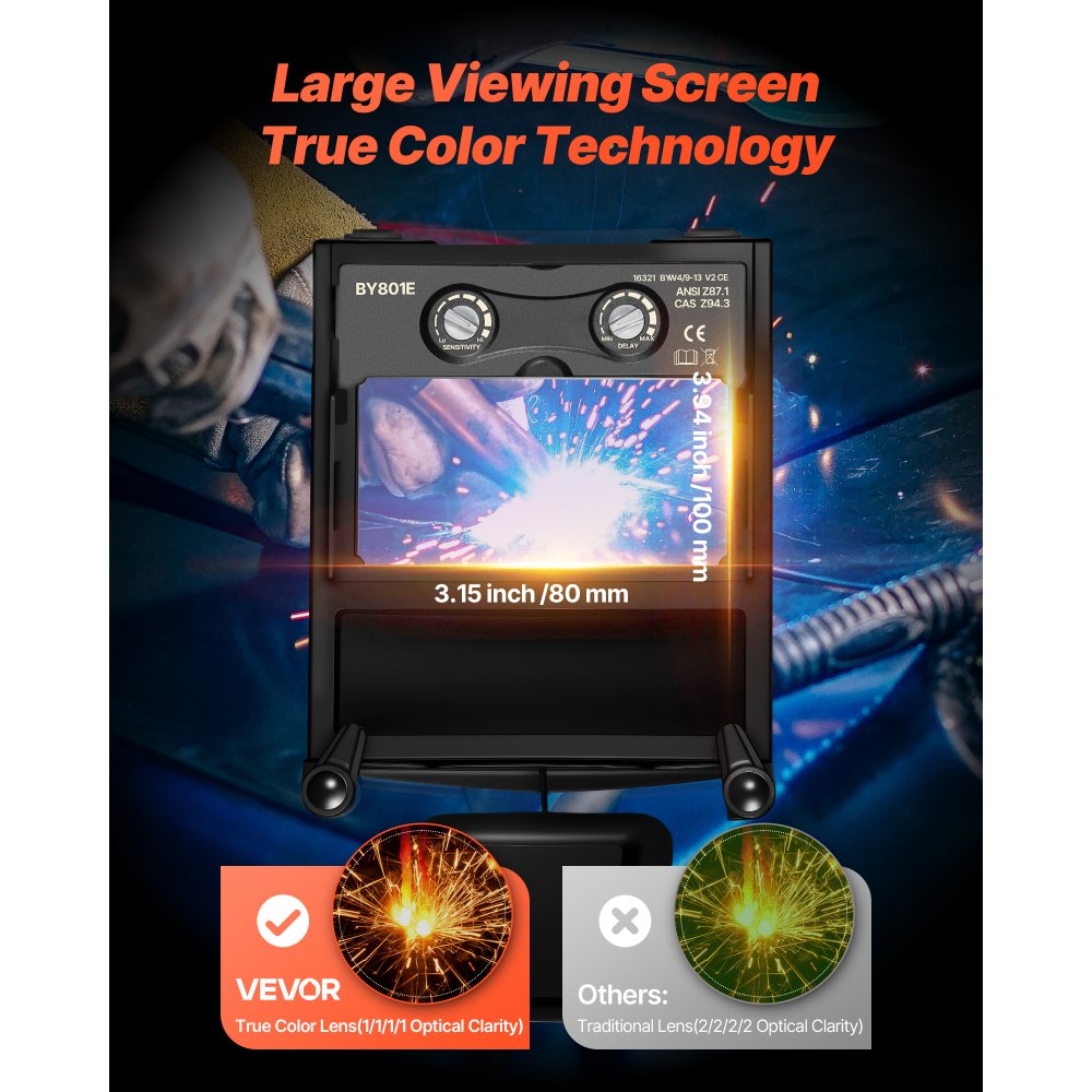 Wyświetlacz True Color: Dzięki ekranowi o wymiarach 3,94 x 3,15 cala (100 x 80 mm), ulepszonej technologii True Color i przejrzystości optycznej 1/1/1/1, hełm spawalniczy VEVOR zapewnia wyraźny, ostry i naturalny obraz, co przekłada się na bezpieczniejsze i bardziej precyzyjne spawanie.