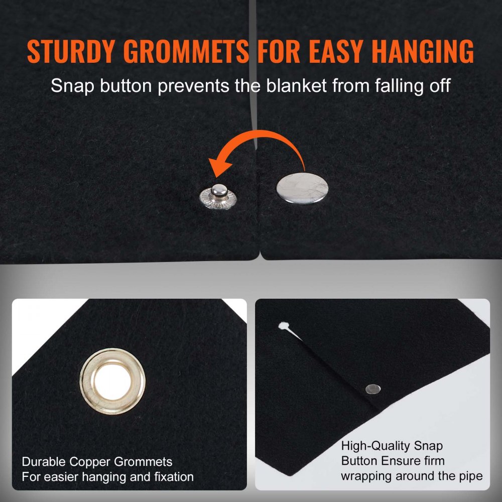 Łatwa w użyciu: Odporna na wysoką temperaturę mata spawalnicza posiada dwa metalowe oczka, które umożliwiają wygodne i stabilne zawieszenie. Posiada również zatrzask pośrodku, który pozwala na ścisłe owinięcie maty wokół rury, zapobiegając jej ślizganiu się i zapewniając stabilność procesu spawania.