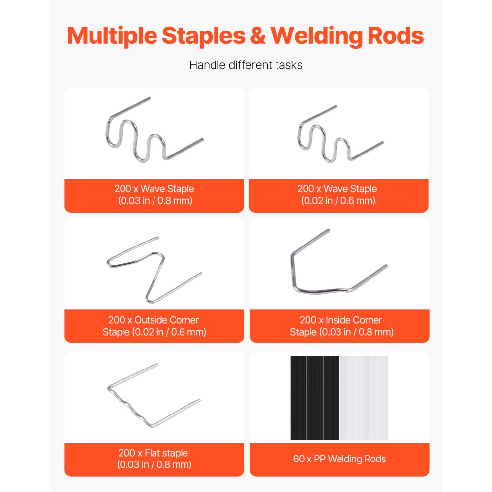 Profesjonalny zestaw do spawania tworzyw sztucznych: Ten zestaw narzędzi do spawania tworzyw sztucznych zawiera 1000 części, 5 rodzajów zacisków termicznych, 60 prętów spawalniczych, 3 końcówki spawalnicze (końcówka do buta spawalniczego, trójkątna końcówka miedziana, końcówka lutownicy), 1 nóż artystyczny, 1 szczypce diagonalne, 1 śrubokręt, 2 siatki ze stali nierdzewnej, 2 gąbki ścierne, 5 taśm aluminiowych i 1 torbę transportową, zapewniając kompletny zestaw akcesoriów dla początkujących i profesjonalistów.