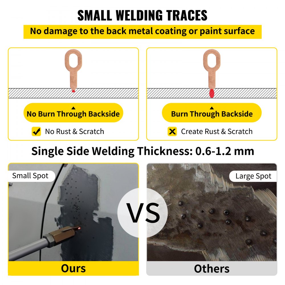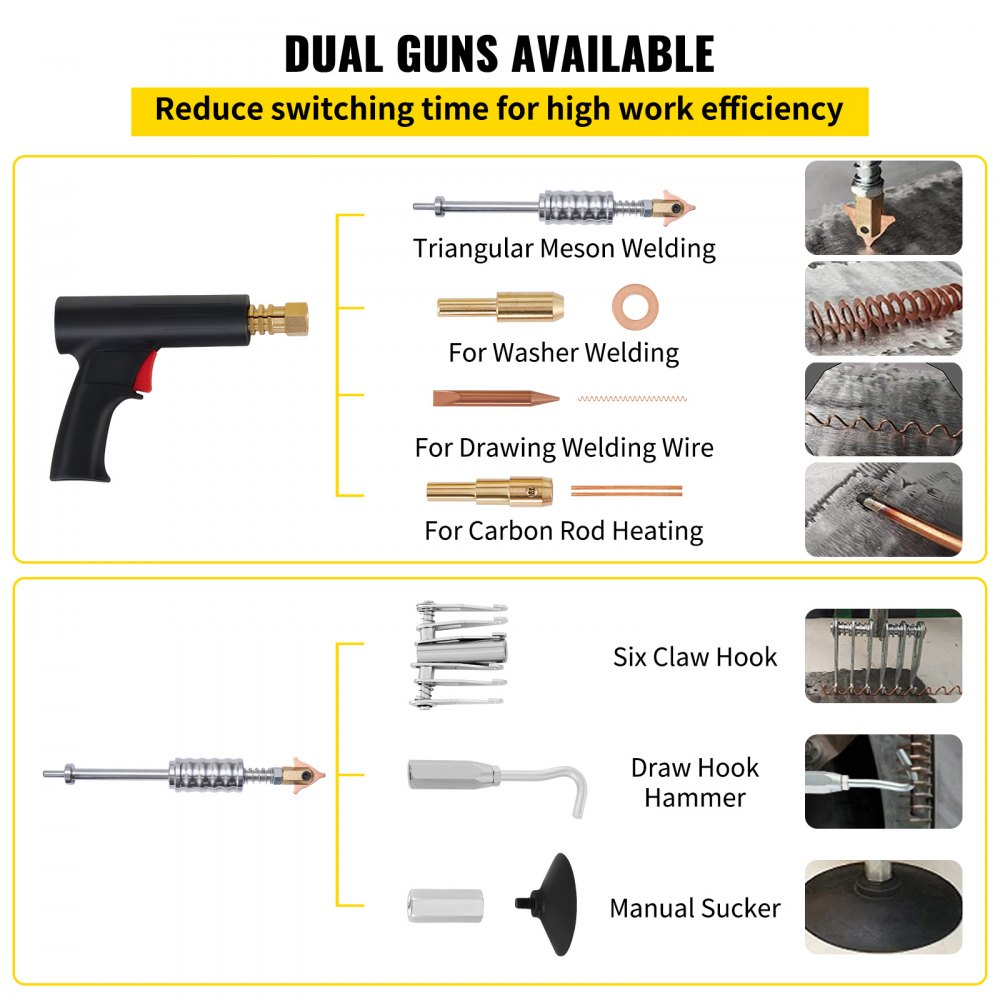 2 mocne pistolety spawalnicze: Palnik spawalniczy i przyrząd do usuwania wgnieceń są wyjątkowo twarde. Wyposażony w 2 pistolety spawalnicze, możesz szybko przełączać się między różnymi funkcjami, a różne akcesoria można wymieniać, aby ułatwić naprawę różnych wgnieceń. Oszczędność czasu i pracy, doskonały pomocnik przy renowacji blachy.