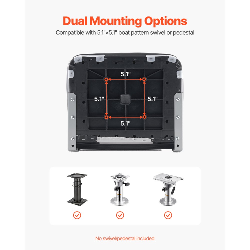 Montaż otworów na śruby 5,1" x 5,1": Składane siedzenie łodzi ma rozstaw otworów na śruby 5,1" (12,95 cm). Dołączamy odporne na korozję śruby i podkładki, dzięki czemu siedzenie można łatwo i bezpiecznie przymocować do większości obrotowych uchwytów lub podstaw łodzi. Należy pamiętać, że podstawa łodzi i obrotowy uchwyt nie są dołączone.