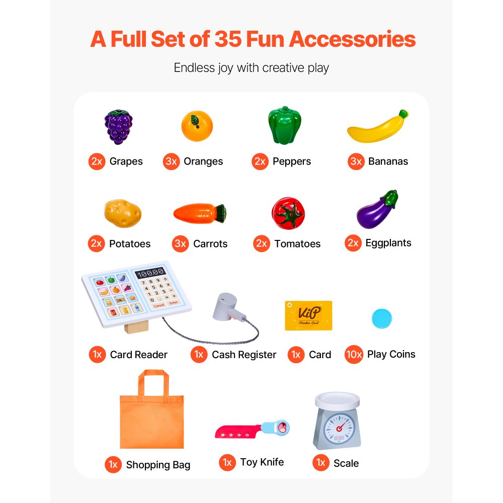 35 ekscytujących akcesoriów: Zabawkowy sklep spożywczy zawiera kasę, wagę, torby na zakupy oraz 20 elementów owoców i warzyw, wykonanych z dbałością o szczegóły. Idealny do intensywnej, interaktywnej zabawy!