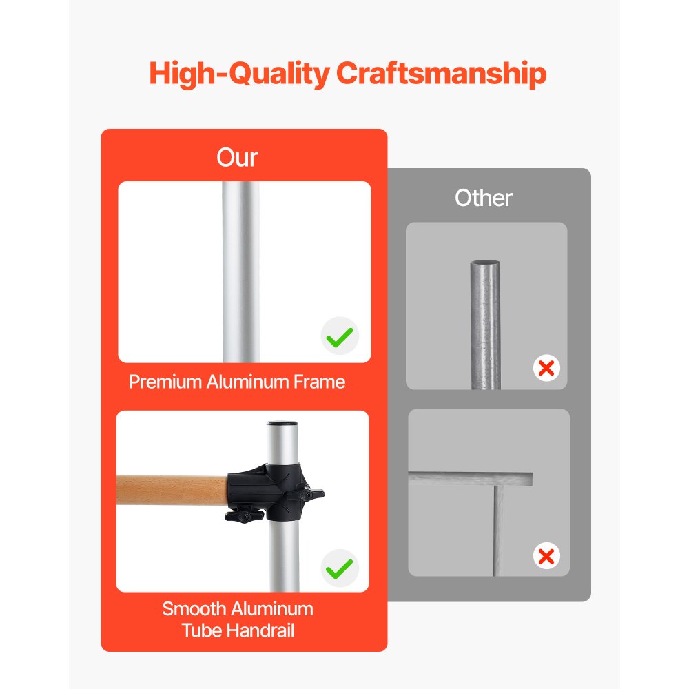Płynna regulacja wysokości: przenośny drążek baletowy wyposażony jest w dwa drewniane drążki o długości 6 stóp (1791 mm), każdy z zakresem regulacji wysokości od 6,7 do 46 cali (170–1165 mm), aby dostosować go do swoich potrzeb poprzez proste przekręcenie pokrętła.