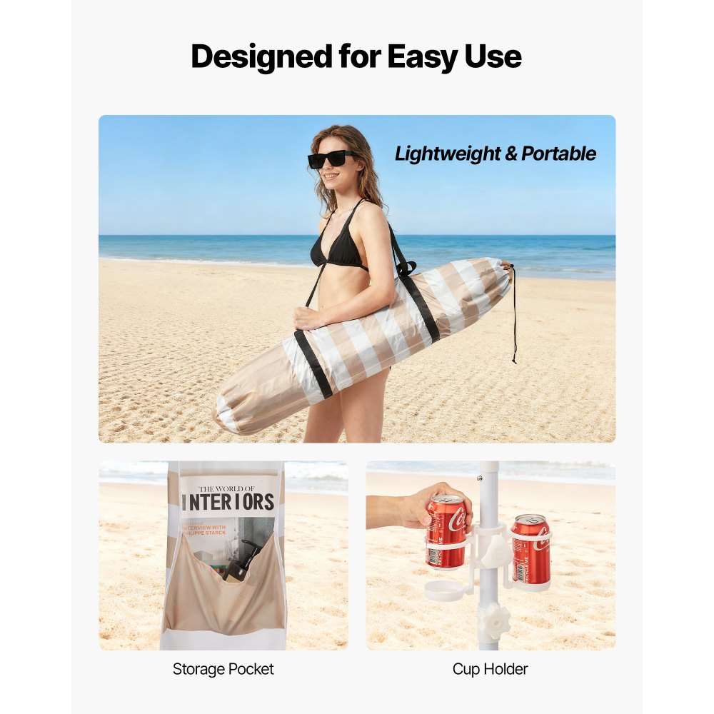 Regulacja wysokości: Duży namiot plażowy wyposażony jest w ulepszony, regulowany drążek łączący, który umożliwia regulację wysokości w zakresie od 2,1 do 2,4 m (6,9 do 7,9 stopy). Zapewnia to więcej miejsca nad głową, dzięki czemu możesz wygodnie stać bez schylania się i cieszyć się szerszym polem widzenia.